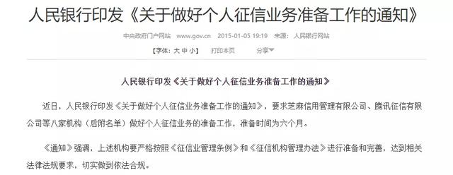 2015年,央行印发了《关于做好个人征信业务准备工作的通知》,要求芝麻信用管理有限公司、腾讯征信有限公司等八家机构做好个人征信业务的准备工作。