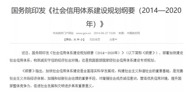 2014年6月,国务院印发 《社会信用体系建设规划纲要(2014—2020年)》,开启了我国首部国家级社会信用体系建设专项规划。