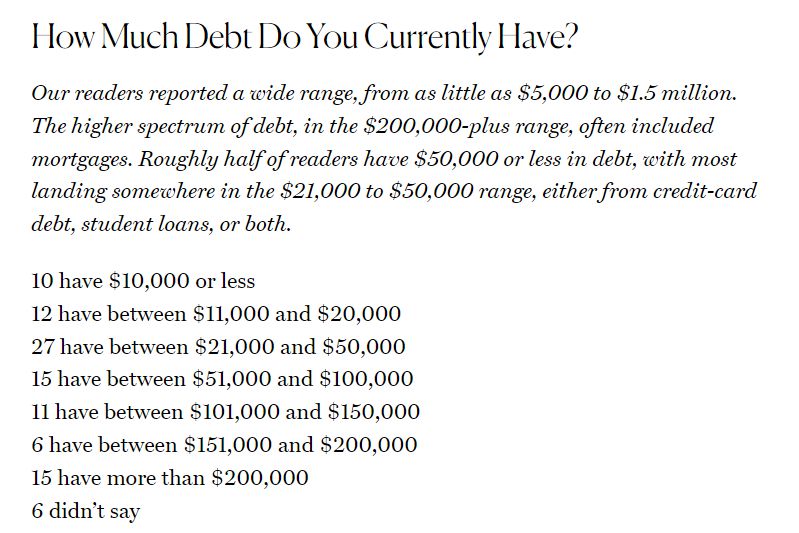 该网站针对102名读者就个人债务问题进行了调查,了解他们如何背负和偿还债务。调查发现,个人债务总额从5000美元到150万美元不等,20万美元以上的债务通常包含抵押贷款。约半数受访者的债务在5万美元及以下,最常见的债务范围在2.1万美元至5万美元之间。