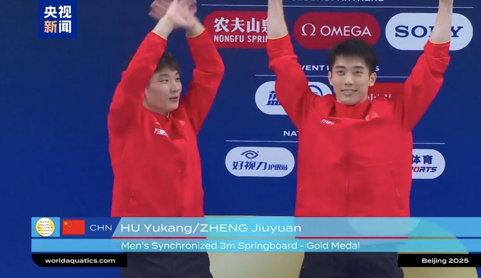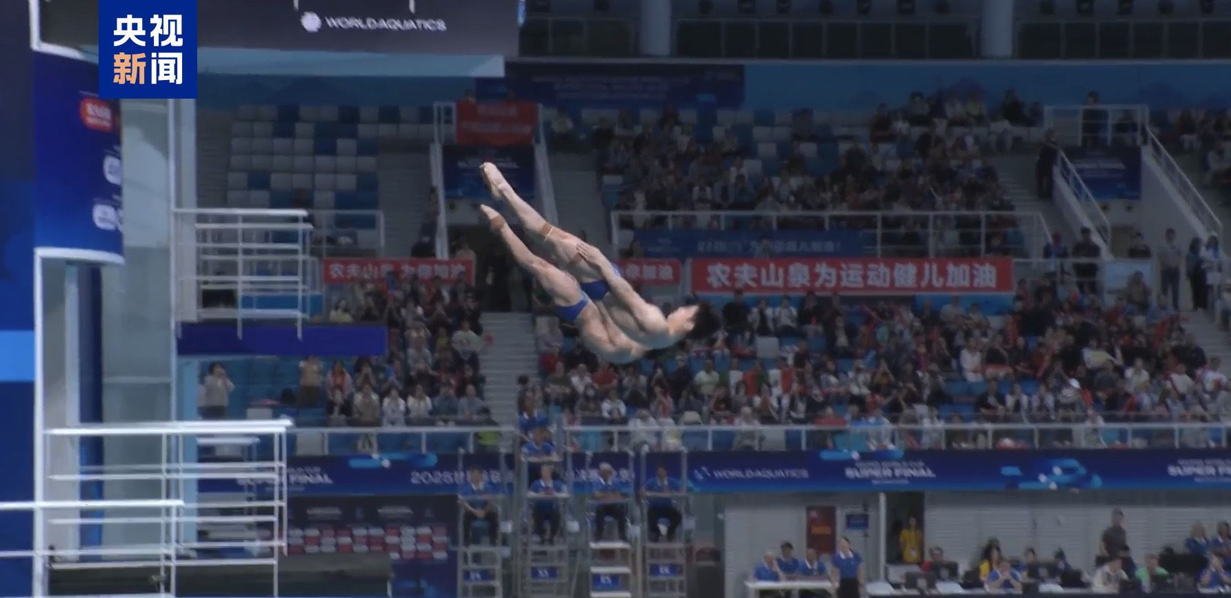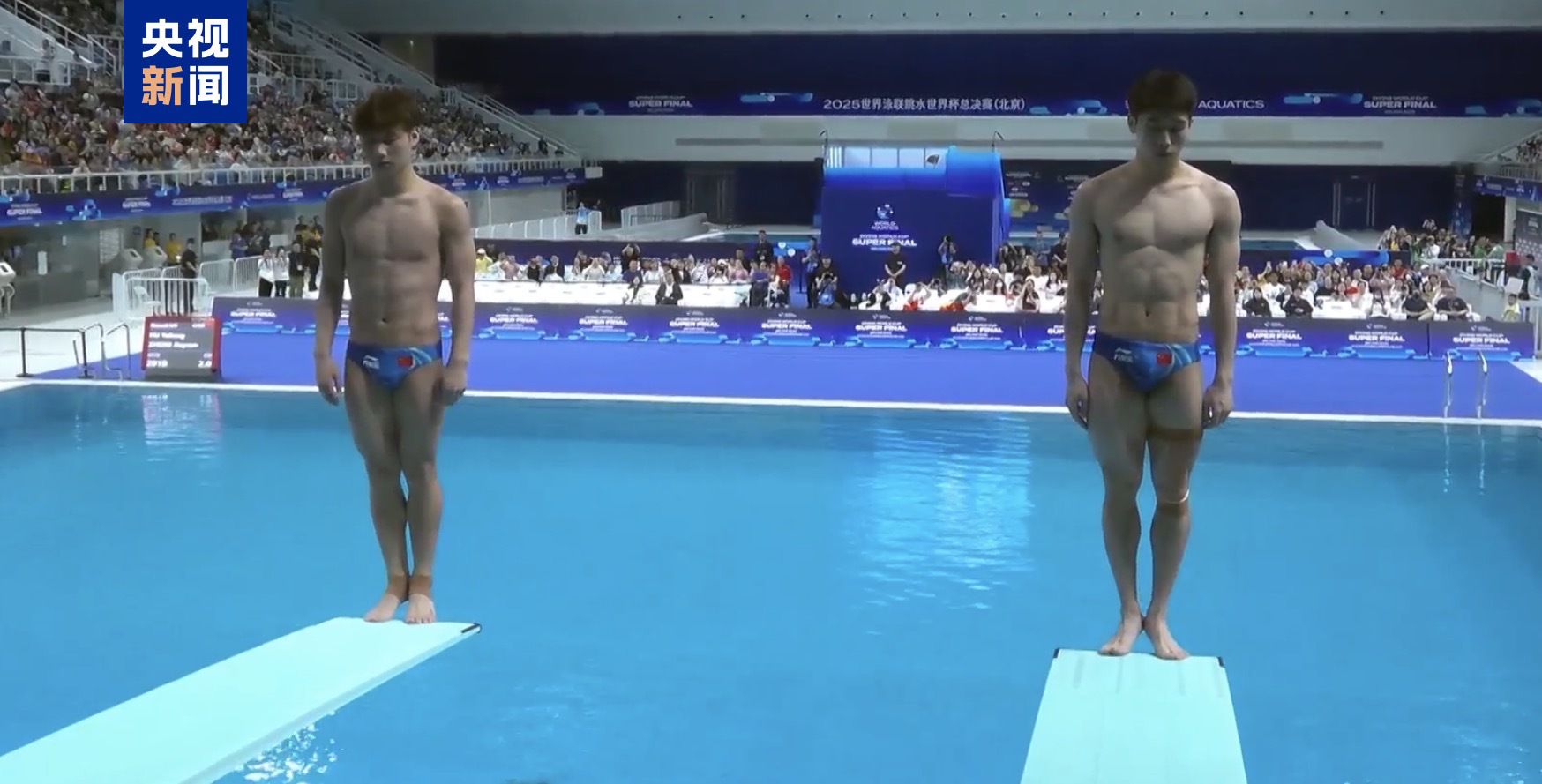 在首先进行的男子双人3米跳板比赛中,胡宇康/郑九源凭借出色发挥,从第一轮起就一直保持领先,最终夺得冠军,为中国跳水队拿下本次总决赛的首枚金牌。