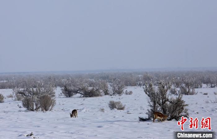 鹅喉羚在雪中觅食。陶拴科 摄 “雪太厚了,这些小家伙们都快找不到吃的了。”王伟边说边将沉甸甸的草料扛在肩上。50多岁的王伟虽已两鬓斑白,但仍步履矫健。
