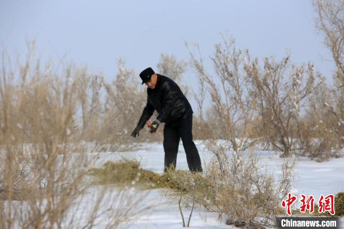 近日,护林员王伟踏着厚厚的积雪,与同事们行走在公益林腹地,为沙漠中的野生动物投放草料。